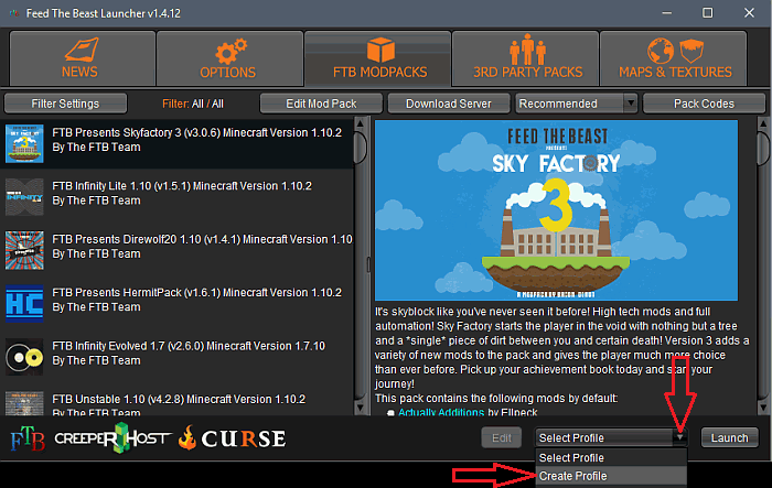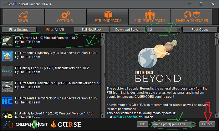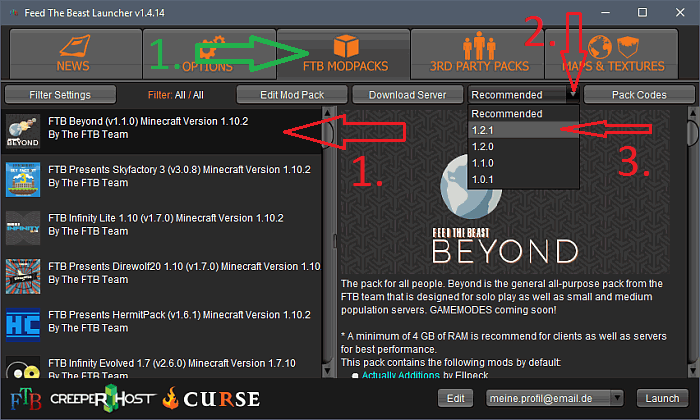 Wähle nun links aus der Modpack-Liste FTB Beyond Danach oben rechts im Dropdown Menü die passende Version auswählen. Meist ist es die aktuellste Version aber frage zur Sicherheit nochmal nach!